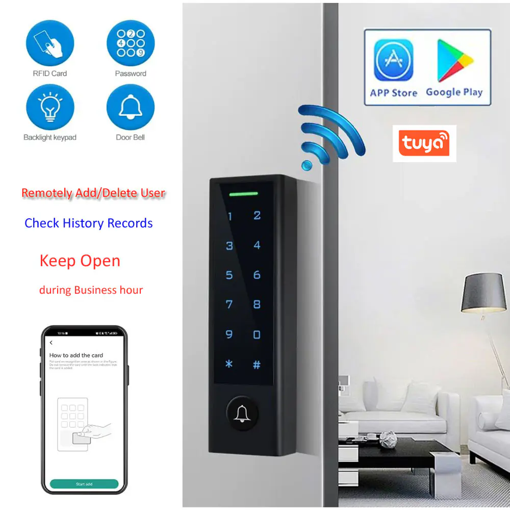 - WiFi Access Control Device, Waterproof, conforms to IP66 Grade,Multiple Access Modes: Smartphone APP, Card, PIN Code, completely running stand alone,Has a door bell button. Has backlight, work indicating light, very convenient to use even at dark.